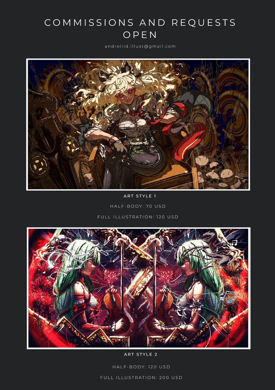 HALF-BODY: One (1) Character and a Plain/No BackgroundFULL ILLUSTRATION: One (1) Character and a Full-Detailed BackgroundADDITIONAL CHARACTER: +50% of the original priceFOR COMMERCIAL USE: Double (2x) of the original priceNOTE: Prices are subject to change depending on the amount of details and complexity of the work.TERMS AND CONDITIONS: